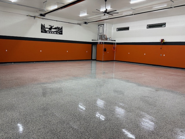We don’t roll paint on concrete and call it done. Every floor is mechanically ground, repaired, and built as a full system—epoxy base, full-broadcast flake, and UV-stable polyaspartic topcoat. That means better adhesion, more durability, and a garage you’re proud to open every day.
