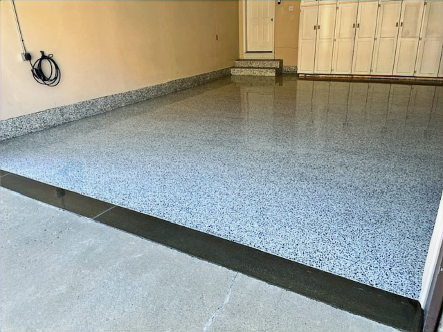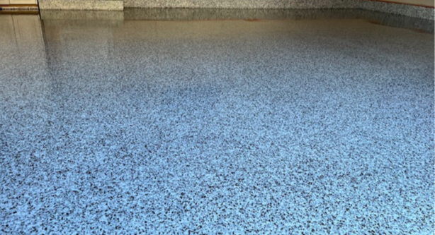 Mechanically ground concrete, full-broadcast flake epoxy, and UV-stable polyaspartic topcoats—for a garage floor that shrugs off hot tires, spills, and daily abuse.